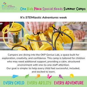 Campers are diving into the OKP Genius Lab, a space built for exploration, creativity, and confidence. This camp is tailored for children who may need additional support, providing a calm, structured environment with one‑to‑one staff attention.